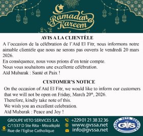 A l’occasion de la célébration de l’Aïd El Fitr, nous informons notre aimable clientèle que nous ne serons pas ouverts le vendredi 20 mars 2026.